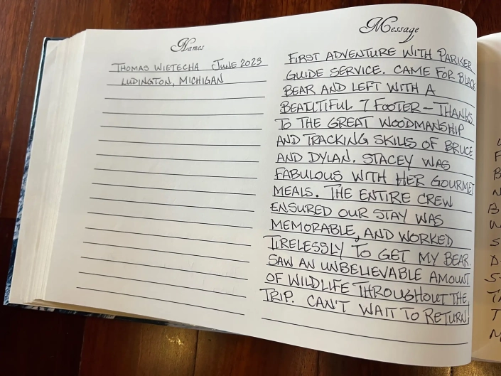 Thanks for a wonderful hunting trip. Accommodations, food, staff, hunting, all excellent! Thanks for a wonderful experience and a nice bear.”